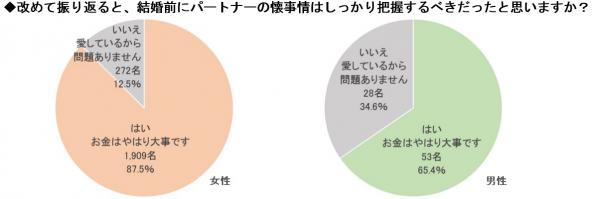 「改めて振り返ると、結婚前にパートナーの懐事情はしっかり把握するべきだったと思いますか?」という質問に対し、女性は9割近くが「はい。お金はやはり大事です」、男性はおよそ3名に1名にあたる34%が「いいえ。愛しているから問題ありません」を選択しています。