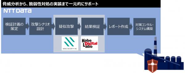 本サービスでは、製造やインフラに携わる事業者の制御系システムにおける疑似攻撃、および発見された脆弱性に対処し、セキュリティを強化するためのコンサルティング、システム構築を一元的に行います。疑似攻撃においては、イエラエセキュリティ、KDLに在籍する技術者が、攻撃者と同じ目線で制御系システムへの攻撃を試み、その過程で得られた情報も活用しながら試行錯誤し、検証対象システムにおける侵入経路を動的に探索します。NTTデータはお客さまによる検証計画の策定や攻撃シナリオの設計を支援するとともに、攻撃プロセスや得られた結果をレポートとして提供するとともに、コンサルティングからシステム構築までセキュリティ強化のための一元的なサポートを行います。