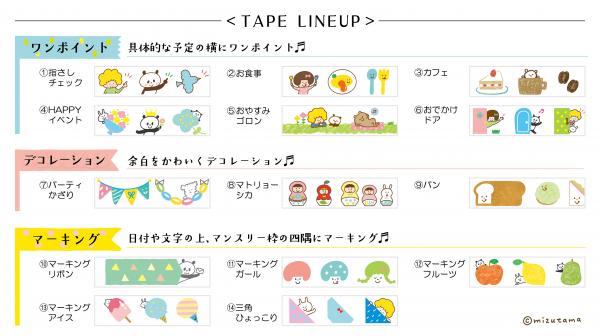 デコレーションテープ 「プチデコラッシュ」太幅タイプ<数量限定>mizutamaデザイン14種類を発売 人気イラストレーターmizutamaさんとコラボレーション♪