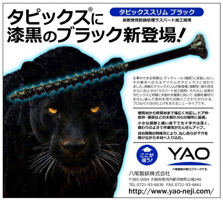 八尾製鋲株式会社(大阪府河南町、社長・河野伸幸)では、主力製品である「タピックス」シリーズの新製品として「タピックススリム」のブラックタイプを近日(11月下旬予定)発売いたします。独自技術のねじ形状を持つ「タピックス」シリーズは、低トルクで堅い木にもしっかり入り、木割れを防ぐ特長が多くのプロユーザーに支持され、業界スタンダードともいえる立ち位置を確立しています。近年、木ねじのセールスにおいては、表面色のブラックアウトが人気を集める傾向が見られ、弊社では、需要の多い「タピックス」でこの動きにシフトしたアイテムを加えることといたしました。もちろん、黒いビジュアルの精悍さに加え、ハイレベルな品質と性能は、これまでの「タピックス」既存品とまったく変わらず、さらには、高耐食性防錆処理であるラスパート加工を採用し、強靭性・耐久性がいちだんと向上したことが大きなポイントです。素材へのニーズがますます多様化を見せる建築業界の現場へ積極的にプッシュをしかけ、黒いビスのトレンドを「タピックス」のブランド力で一気にキャッチアップする展開を進めます。なお、発売日や販売取り扱いの商社・小売店などの詳細につきましては、八尾製鋲営業部に直接お問い合わせください。