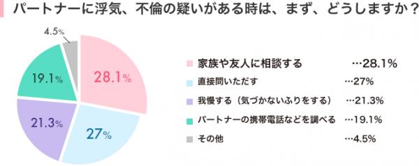 パートナーの浮気を疑った際に、最も多い行動は「家族や友人に相談する」で約28%。