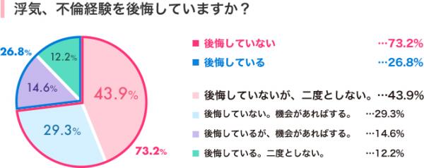 特筆すべきは、「後悔していない」に該当する回答者が73%以上となっている点です。また、後悔しているしていないに関わらず、「機会があれば再度、浮気や不倫をする」と回答した方の割合は約44%にのぼります。