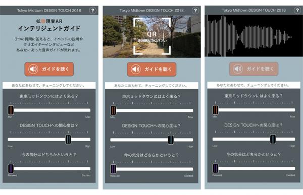 会場の各所に設置された紹介パネルに掲載されているQRコードをスマートフォンで読み取り、Webサイト上で「東京ミッドタウンへの訪問頻度」「デザインタッチへの関心度」「いまの気分」の3つの質問に関する回答をメニューバーのレベルを調整することで、約50種類以上のパターンから、その時・その人に合った音声ガイドが生成されます。
