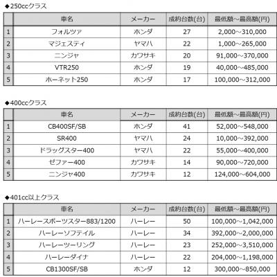 オークネット バイクオークション9月成約排気量別ランキング