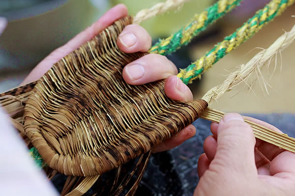 編み込んだままの竹皮の程よく立った感触は、手技だからこそ出せるもの。竹皮を贅沢に使い力を込めてギュッと編み込む様子を見ると、竹皮草履を履いた時、心地よく足裏を刺激する理由が納得できます。