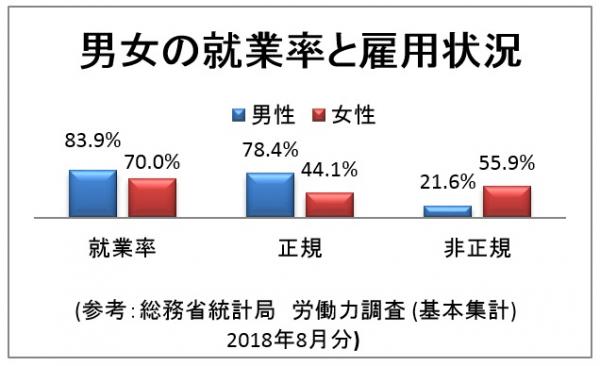 2018年8月総務省統計局の労働力調査によると、15〜64歳の女性の就業率が、対前年同月で2.1ポイント増加の70.0%と過去最高に達しています。男性は83.9%となっています。一方で、女性の正規の職員・従業員率は44.1%と、男性の78.4%と比べると決して高いとは言えない現状があります。