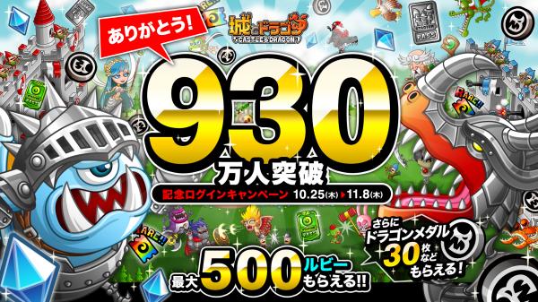 『城とドラゴン』で「930万人突破記念ログインキャンペーン」が10月25日(木)より開催!最大500ルビーやドラゴンメダルがもらえる!