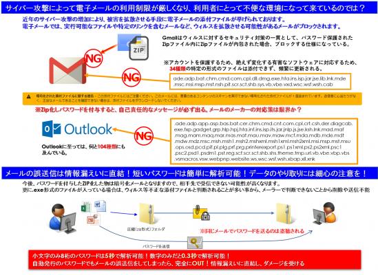 また、暗号化されたZIPファイルを開けるためのパスワードを別メールで送る事は、「メールの盗聴対策」や「メールの誤送信対策」と言う見解があるが、同一のメール経路で送るのは、窃取される可能性は十分にあり得る。また、短いパスワードは簡単に解読されるので、大文字や小文字、更には英数字を合わせた物が好ましい。今後、パスワードを付与したZIP化した物は暗号化メールとなるので、相手先で受信できない可能性が高くなる。中国の拠点や顧客等にはセキュリティを施したPDFも受信することはできない。