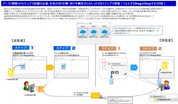 経済のグローバル化が急速に進展する中で、情報共有は必要不可欠な事項になっております。しかし、今まで有効手段であったメール活用による情報の授受は誤送信による情報漏えいリスクが高く、企業に深刻なダメージを与える事にもなりかねません。また、ZIP化しパスワードを掛けると添付すらできなくなります。データを送る・届けるという事象は今後様々な制約を受ける可能性が非常に高くなると想定されます。この事象は著しく業務の効率を低下させます。このような状況の画期的な解決ソリューションが、クラウドストレージを情報共有基盤とした、安全・時短・低コストで情報共有を可能とする画期的ソリューションが『Pro-Porter』です。本ソリューションがネットワークを介して授受するデータや、クラウドストレージにストレージに一時保管されるデータは秘密分散技術で無意味化され、不完全な状態になりますので、個人情報或いは機密情報、著作権情報を確実に守ります。弊社は世界規模のクラウドストレージは元より、国内のデータセンターとも連携を強化し、お客様にとって有益であり、情報をあらゆる脅威から守り、利便性を兼ね備えた新たなるセキュリティソリューションを提供して参ります。