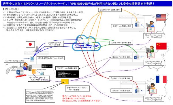 世界中の国々とクラウドストレージをHUB(中継局)にして情報の共有・交換を安全に実現致します。クラウドストレージに一時保管されるデータは『Pro-Porter(秘密分散技術)』によって無意味化され、不完全な状態になっておりますので、漏えいの心配はありませんし、窃取されたとしても利用価値は0です。VPN接続が利用できない国や暗号化が禁止されている国とでも、復元のキーとなりメールに添付するインデックスファイルはテキストですので、問題なく受領されますし、分割片も同様のファイルなので何処の国やエリアとでも開通致します。データを持たなければ、つまりデジタルの情報を持たなければインシデントは起こりえません。