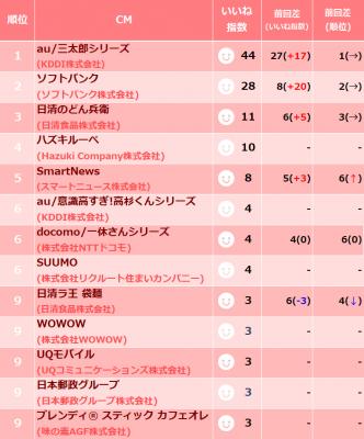CMランキング/アンケート発表・2018年10月中旬・CMいいね指数アンケートの結果を発表。トップはau三太郎シリーズのCM。ユーザーコメントも公開/CM-TVRider;tv-rider.jp