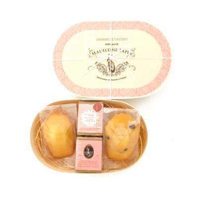 「マリー・アントワネット」のティーバッグ2個と、マドレーヌ2個を、マドレーヌの伝統的な木箱に詰め合わせました。