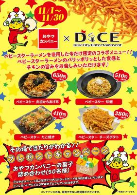 株式会社シティコミュニケーションズ(本社:横浜市神奈川区 代表:三田大明)が運営するインターネットカフェDiCEの食事提供店舗(仙台店、大宮店、赤羽店、自由が丘店、新小岩店)におきまして、2018年11月1日から11月30日の期間限定で、株式会社おやつカンパニーの看板商品で発売60年目を迎えた「ベビースターラーメン」を使用したコラボメニューを販売いたします。