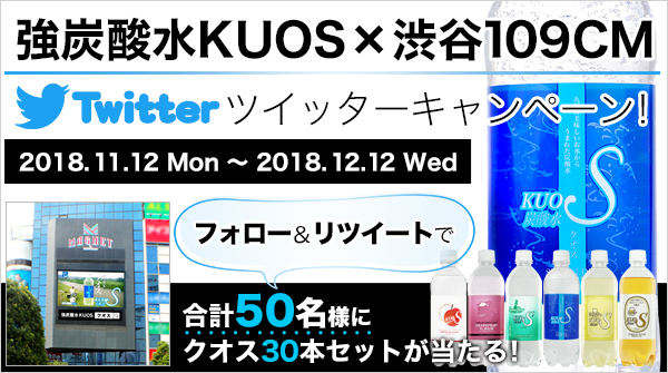 ツイッターの応募で合計50名様に 強炭酸水KUOSスペシャルバラエティ30本セットが貰える!! 渋谷109フォーラム「KUOS CMいいね」ツイートキャンペーン