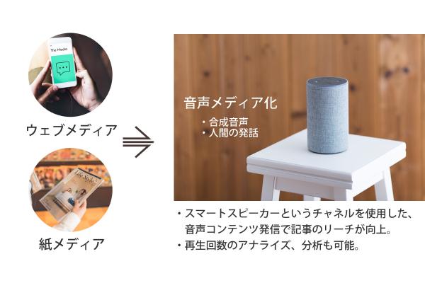 本提携では、出版社やウェブメディアのすでにある記事コンテンツや日々運用するメディア・コンテンツの原稿を、消費者の家庭にあるスマートスピーカー上から合成音声やアナウンサーの発話によって音声コンテンツとして提供することで、メディアとしてのチャネルを拡大しメディアとしての価値を高めるための導入支援を実施いたします。
