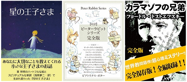 今回割引対象となるタイトルは、2018年10月の【文学】書籍のダウンロード数ランキング(集計対象ストア:Kindleストア、楽天Kobo電子書籍ストア、Google Play、iBooks、SONY Reader Store、Yahoo!ブックストア)で1位に輝いた『星の王子さま』、2位の『【対訳】ピーターラビットシリーズ 完全版 かわいいイラストと、英語と日本語で楽しめる、ピーターラビットと仲間たちのお話!』、3位の『カラマゾフの兄弟 完全版』の計3作品です。