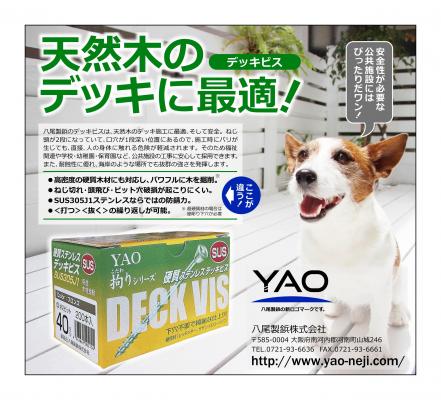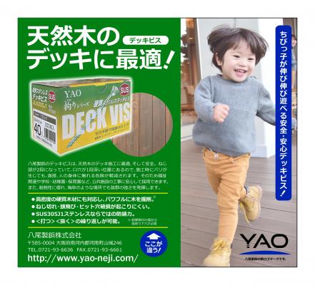 八尾製鋲株式会社(大阪府河南町、社長・河野伸幸)では、天然木ウッドデッキの工事用ビス「デッキビス」の箱型パッケージをリニューアルいたしました。同品は、天然木を使った本格派のウッドデッキ工事を需要ターゲットとした製品です。天然木のウッドデッキは、木の風合いが伝わる癒し感が人気を博し、近年、建築件数が右肩上がりに伸びています。弊社の「デッキビス」は、このようなニーズの増加をキャッチするとともに、当該のジャンルでもっともクオリティの高い、いわば決定版となることを意識して開発されました。まず、独自技術のねじ形状によりパワフルな掘削性能を実現。硬質木材にも対応し、下穴を開ける工程を省力できます(座彫り下穴が必要となる場合もあります=超硬質木材)。また、優れた耐食性を持つSUS305J1ステンレスを採用。海岸沿いなどのサビが起こりやすい環境でも非常に高い防錆力を発揮します。さらには、ねじ頭が面落ちになっていて、四角穴が1段深い位置にあるので、施工時にバリが生じても、直接、人の身体に触れる危険が軽減されます。そのため福祉関連や学校・幼稚園・保育園など、公共施設のウッドデッキに安心して使えます。これらの特長をグリーンとイエローの2色で彩ったオリジナル新パッケージで包み込み、高付加価値なプロ向け商材のステージで、指名買いされる確固としたポジションの構築に取り組みます。新しいパッケージは、10月31日よりホームセンターなどで流通。販売取り扱いの商社・小売店などの詳細につきましては、八尾製鋲営業部に直接お問い合わせください。
