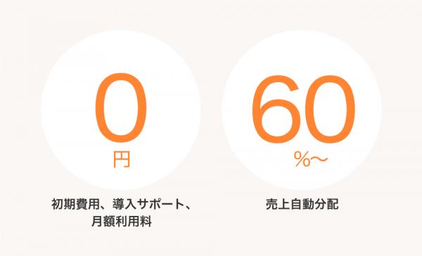 「初期費用0円」「月額利用料0円」「売上の60%以上を自動分配」!