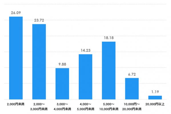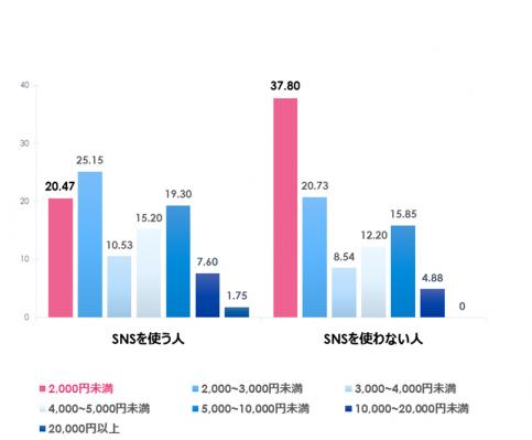 さらに「2,000円未満」と「5,000円以上」に注目すると、情報源としてSNSを使う人は「2,000円未満」20.47%より「5,000円以上」28.65%の割合が高くなりました。一方、SNSを使わない人はその逆の結果になっており、「2,000円未満」37.80%より「5,000円以上」20.73%の割合が低いです(図5参照)。