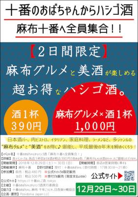 仕事などで年末の予定が立たないまま都内に居る人の為に開催する、『十番のおばちゃんからハシゴ酒』。本イベントは、リストバンドを購入すると、チャージ料、お通し代がかからず、本イベントの各参加店を、自由にはしごする事ができる、お得なグルメイベントです。今回は、麻布十番1〜4丁目に、それぞれジャンルの違う、個性豊かな、厳選した6店舗をご用意いたします!各店では、お酒1杯、390円で呑める他、本イベント限定の、「各店自慢のグルメ+お酒のセット」もご用意!「笑いあり!美酒・美食あり!出会いあり♪」そんな素敵な2日間で2018年を締めくくりましょう!