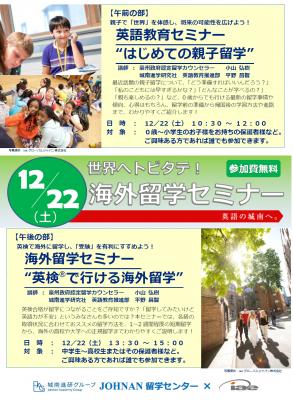 「城南予備校」や「城南コベッツ」、「くぼたのうけん」などを運営する株式会社城南進学研究社(本社:神奈川県川崎市、代表取締役:下村勝己)は、2018年12月22日(土)に、iaeグローバルジャパンとともに「世界へトビタテ! 海外留学セミナー」を共催いたします。