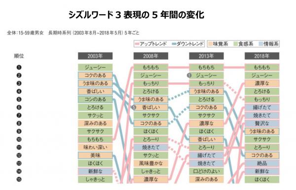 大きな変化をふたつあります。ひとつは食感系の表現のオノマトペ化です。感覚をそのまま表す言葉であるオノマトペにおいしさを感じるようになったことです。とくに「もちもち」「もっちり」「とろける」「とろーり」といった、〈もち〉〈とろ〉といった言葉を頭にしたシズルワードが順位をあげています。そして、「コシがある」「歯ごたえのある」「歯ざりがよい」といった言葉の順位が下がっています。「歯」よりも「もち」、感覚をそのまま表す言葉「もち」「とろ」といったオノマトペにおいしさを感じるようになったことです。