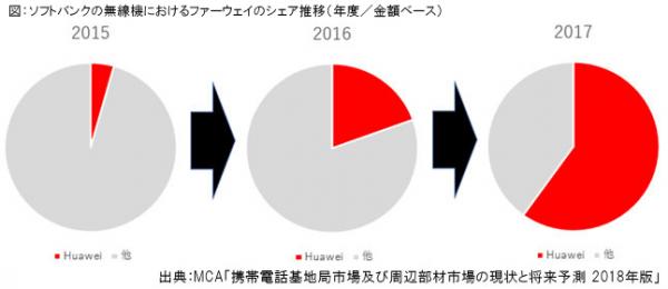 新規で割り当てられた3.5GHzや追加発注が多かった700MHz帯で確実に受注を重ねていった結果、同年のソフトバンクの新規基地局の6割弱をファーウェイが獲得するまで成長した。