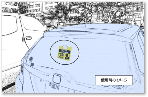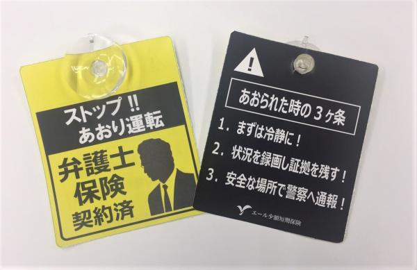 自動車のリアガラスに車内側から吸盤で貼り付けるもので、後続車にトラブルになれば弁護士に相談するということを警告し、あおり運転の被害防止に繋げるものです。