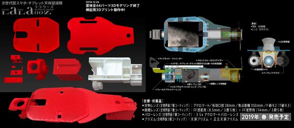 製作中の次世代型スマホ・タブレット天体望遠鏡『LaLaooz』は現在、筐体全44パーツの3Dモデリングが終了し、検証用3Dプリントの製作段階に入っている。