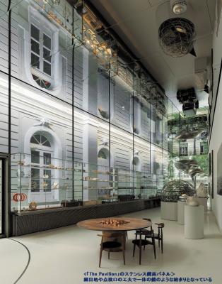 「みえない点検口天井システム」の元となる技術は、2017年竣工のスペイン・マドリッドのプロジェクト「The Pavilion」のステンレス鏡面天井パネル用に開発されました。世界的な建築家ノーマン・フォスター卿(*2)が所有するアート作品を展示するにあたり、展示物だけに照明を当てることのできる特殊照明を天井に組み込むため、天井140m2に対して18箇所の点検口が必要でした。そのパネル設計の際、施主であり意匠設計も担っていたノーマン・フォスター・ファンデーション(Norman Foster Foundation)より、パビリオンの来場者に対して目地をできるだけ目立たないように細くすることと、点検口パネルと判からないように鍵穴やロック機構が見えない納まりを提案して欲しいとの要望があり、その実現のため菊川は機構や納まりを考案したことが開発のきっかけとなりました。