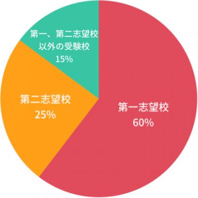 受験を終えられたお子さんの進学先を教えていただきました。第一志望校に進学されるお子さんは60%、第二志望校に進学されるお子さんは25%、第一、第二志望校以外に進学されるお子さんは15%という結果になりました。