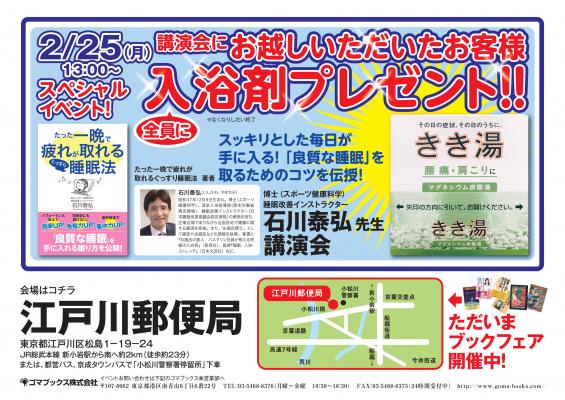 ゴマブックス株式会社(所在地:東京都港区、代表取締役社長:赤井仁)は、2019年2月25日(月)13時から、江戸川郵便局にて新刊書籍『たった一晩で疲れが取れるぐっすり睡眠法』の著者・石川泰弘先生によるスペシャルイベントを開催いたします。