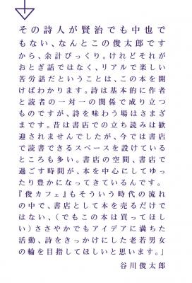一人の詩人が書いた詩からカフェが生まれた!なんだかおとぎ話のように思えます。その詩人が賢治でも中也でもない、なんとこの俊太郎ですから、余計びっくり。けれどそれがおとぎ話ではなく、リアルで楽しい苦労話だということは、この本を開けばわかります。詩は基本的に作者と読者の一対一の関係で成り立つものですが、詩を味わう場はさまざまです。昔は書店での立ち読みは歓迎されませんでしたが、今では書店で読書できるスペースを設けているところも多い。書店の空間、書店で過ごす時間が、本を中心にしてゆったり豊かになってきているんです。「俊カフェ」もそういう時代の流れの中で、書店として本を売るだけではない、(でもこの本は買ってほしい)ささやかでもアイデアに満ちた活動、詩をきっかけにした老若男女の輪を目指してほしいと思います。 谷川俊太郎