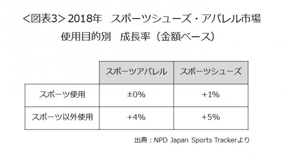 スポーツアパレル・シューズの使用目的*2についても調べています。2018年はスポーツシューズ・スポーツアパレル共に「スポーツ以外への使用目的」の成長率が「スポーツへの使用目的」の成長率を上回っています(図表3)。