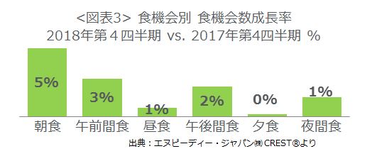 食機会別の食機会数成長率(図表3)をみると、夕食のみ横ばいで、他の食機会はすべて増加しました。特に、朝食は5%増と大幅な成長を示しました。朝食の成長は、スーパーとコンビニの伸びがけん引しています。