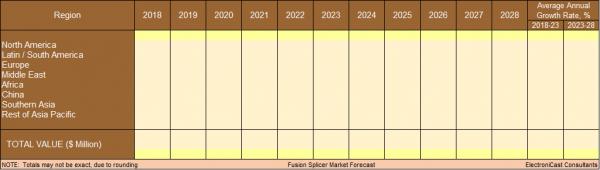 This ElectroniCast report provides our estimates and forecasts of the consumption value of fiber optic fusion splicers, segmented into the following geographic regions: