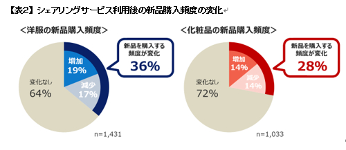 ・洋服のシェアリングを行う全回答者のうち、36%はフリマアプリ利用後に新品購入頻度が変化したと回答し、うち19%のユーザーが増加したと回答。