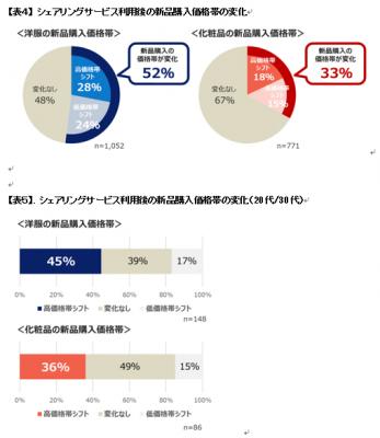・洋服のシェアリングを行う回答者のうち52%が「フリマアプリ利用後に購入する洋服の価格帯」に変化が生じ、うち28%のユーザーは高価格帯のブランドにシフトしたと回答。