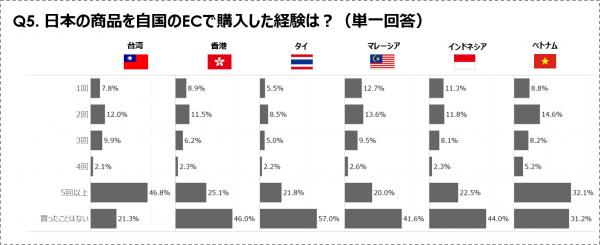 “日本好き”の人たちに対し、自国のECサイトで日本の商品の購入経験を聞いた質問では、一度でも購入したことがある人は台湾が最も多く79%。今回から調査が始まったベトナムが69%、香港54%、インドネシア56%、マレーシア58%、タイ43%。半数以上か半数近くの人が日本の商品を購入しているという結果になりました。また、5回以上と答えた人も、台湾で47%、ベトナムで32%と多くなっています。
