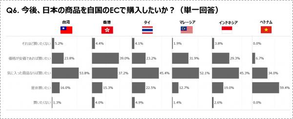 とは言え、「是非買いたい」という積極的な答えがベトナムの次に多かったのはタイの22%。インドネシア19%、台湾16%、香港15%、マレーシア13%で、意外と少ないという印象があります。また、「気に入った商品なら買いたい」「価格が安価であれば買いたい」が合わせて75%越えになったのは香港・台湾で、マレーシアは84%。商品を慎重に選んでいる傾向にあるのかもしれません。
