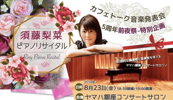 世界中の講師と生徒をつなぐオンライン習い事サイト「カフェトーク( http://cafetalk.com/)」を運営する株式会社スモールブリッジ(本社:東京都渋谷区、代表取締役:橋爪小太郎)は、第5回カフェトーク音楽発表会の前日となる2019年8月23日(金)に、ヤマハ銀座コンサートサロンで行われる『音楽発表会5周年前夜祭 特別企画〜須藤梨菜ピアノリサイタル』のチケット販売を2月27日(水)より開始しました。