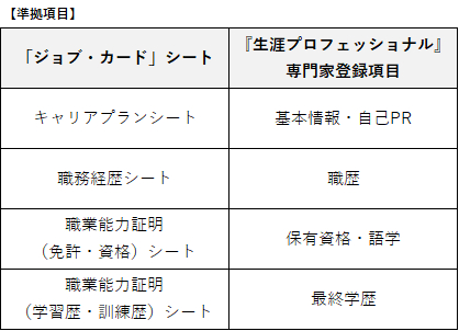 シニア専門家の登録項目を、「生涯を通じたキャリア・プランニング」及び「職業能力証明」のツールを提供するジョブ・カードの様式に準拠することで、シニア人材のこれまでの経験・職歴の棚卸し及び、企業の経営支援可能な専門領域やスキル・知見の見える化を図り、企業とシニア人材のマッチング精度を高めることを目指します。