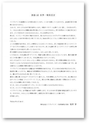 株式会社トリプルアイズ(本社:東京都千代田区、資本金:3億7千万円[資本準備金を含む])の代表取締役 福原 智が「囲碁AI 世界一奪取宣言」を発表致しました。