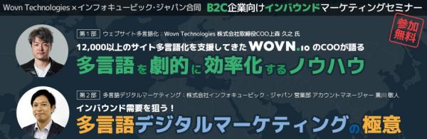 海外デジタルマーケティングの支援を行う株式会社インフォキュービック・ジャパン(本社:東京都新宿区、代表取締役:山岸ロハン、以下インフォキュービック)は、平成31年4月19日(金)14:00より「【Wovn Technologies×インフォキュービック・ジャパン合同セミナー】ウェブサイトを多言語化して、インバウンド需要を多言語マーケティングで掴む!〜 B2C企業向けインバウンドマーケティングセミナー 〜」を、関東ITソフトウェア健康保険組合(山王会館)にて開催いたします。ますます活気に沸くインバンド市場の波に乗り遅れないように、英語だけでなく中国語、スペイン語、ポルトガル語といった多くの言語に対応した良質なウェブサイトの構築が必須となってきています。しかしサイトの多言語化が済んだとしても、「集客施策はまだ」といった企業様も多いようです。そこで今回は、あらゆるウェブサービスの多言語化はもちろん、運用の最適化をサポートするなどのサービスを提供するWovn Technologis株式会社と、「広告」「SNS」などマルチチャネルの多言語デジタルマーケティングに特化した株式会社インフォキュービック・ジャパンがタッグを組み、日本企業様のインバウンド需要を刈り取るための共催セミナーを開催します。この貴重な機会にぜひ奮ってご参加ください!
