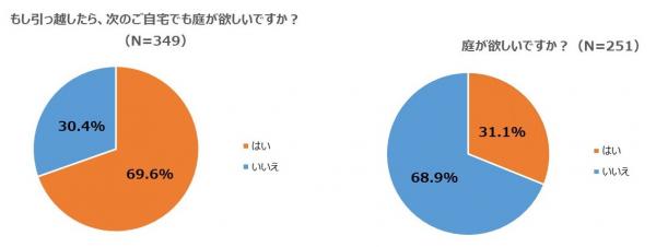 「庭がある」人は、もし引っ越しても、次の自宅でも庭が欲しいのでしょうか?『はい』(69.6%)、『いいえ』(30.4%)となり、約3割の人はいらないと思っていることがわかりました。