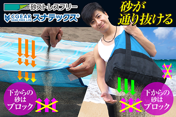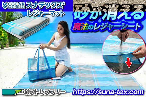 ビーチでの「砂・ストレスフリー」を実現する、砂が消える魔法のレジャーシート【スナテックス】が今年も登場!米軍が採用した特許取得の特殊二層織り構造で、舞い込んだ砂は一瞬で消え下からの砂も完全ブロック!