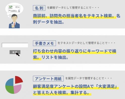 現在はリードデータの核となる名刺の自動データ化テクノロジーを発展させたサービス展開にチャレンジ。スキャンした紙資料を自動データ化する“ペーパーレス”や紙資料をスキャンするだけで顧客管理が可能になる“データインプットゼロCRM”など企業全体でご利用頂けるサービス・コンサルティングサービスの開発に取り組んでおります。