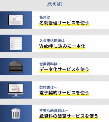 名刺は名刺管理システム、契約書は電子契約サービスなどペーパーレス化した紙資料に合わせ最適な代替ツールや仕組みを提供致します。