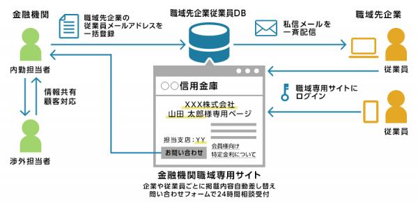 本ソリューションは、職域先の役職員限定Webサイトである職域サイトとメール配信を活用し、金融機関の職域営業を支援するソリューションです。具体的には職域先の役職員に対し、お伝えしたい情報を視認性の高い私信メールでお届けし、職域先限定の特典を職域サイトでいつでも閲覧できるようにすることで、利便性を高めます。また、みずほ銀行が職域サイトなどの運用ノウハウをコンサルティングすることで、効率的かつ効果的な職域営業活動を支援します。