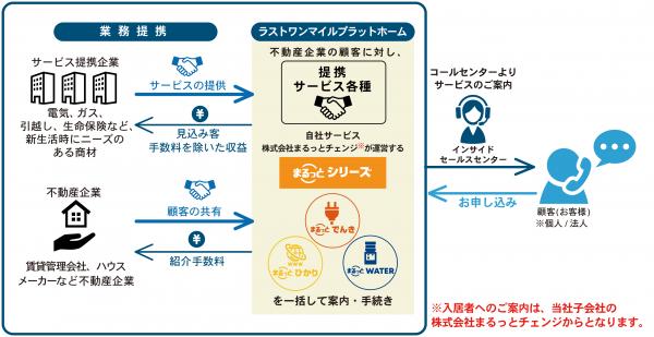 『ラストワンマイルプラットフォーム』が入居者などの顧客へ提供するサービスは、自社事業である『まるっとシリーズ』(電気・通信・ウォーターサーバー)に提携企業のサービスを加え、2019年3月現在35項目のサービスを用意しています。今後は水道の民営化も見据え、電気・ガス・水道・通信の全てのライフラインを自社事業化し、より便利で安価なサービスを顧客へ提供できるよう進めて行きます。